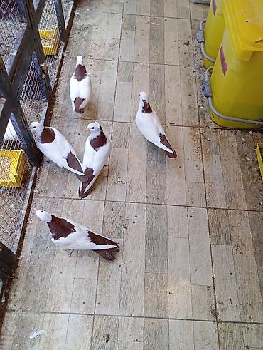 4 denedi ağ göy Xüsusiyyətlər: - Növ: yüksəkboyun, iri bədənli ev göyərçinləri - Rənglər: biri tünd qara (ayaqlarda ağ corab), digəri boz-qonur “kölgəli” naxışlı - Gözlər: iri, dairəvi halqalı - ...