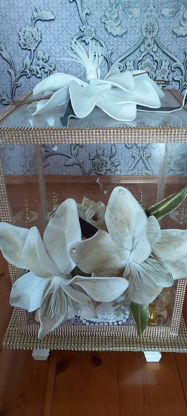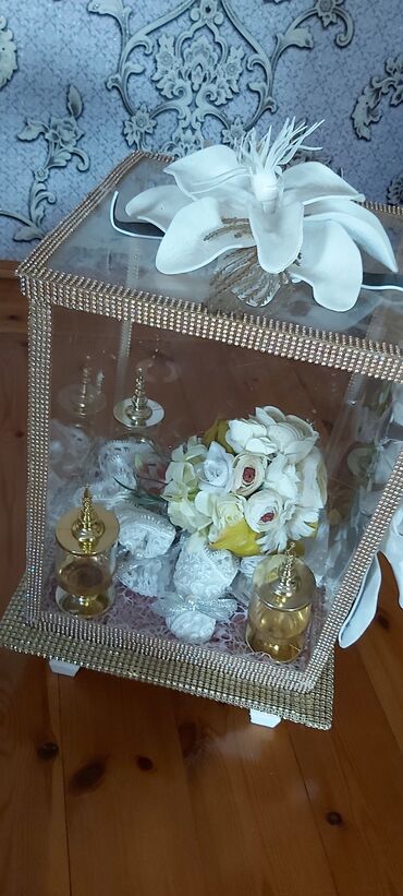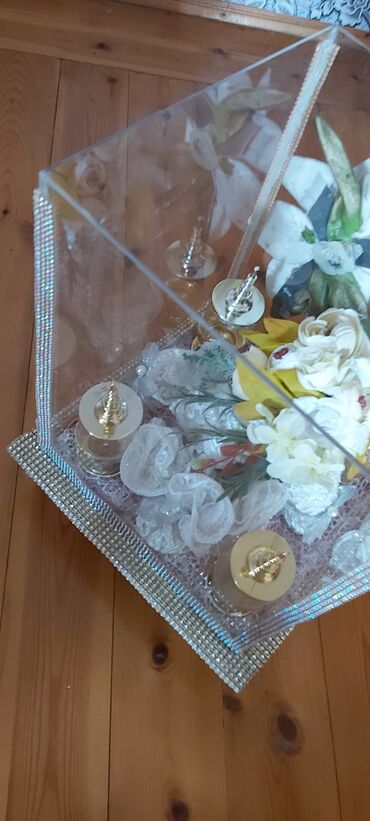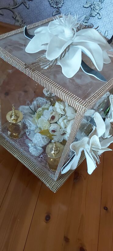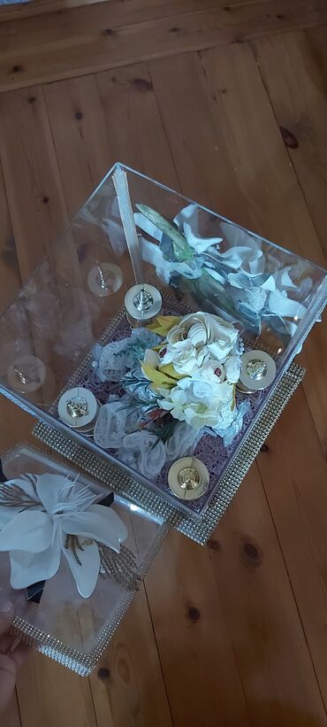 Nabat xoncasi. Şəffaf materialdan hazırlanmış, zərif qızılı rəngli bəzəklərlə əhatə olunmuş bu Nabat xoncasi, xüsusi günlər üçün zərif bir təqdimat vasitəsidir. Qutunun dörd tərəfi şəffafdır, bu da içərisindəki hədiyyənin asanlıqla görünməsini təmin edir. Yuxarı və aşağı kənarları qızılı rəngli incə daşlar və ya boncuklarla bəzədilmişdir. Qutunun daxilində ağ rəngli süni çiçəklər, 4 eded Nabat qabi və digər dekorativ elementlər yerləşir. Üst hissəsində də böyük, ağ rəngli süni çiçək bəzəyi var. Dörd kiçik ağ ayaq üzərində dayanan bu qutu, hər hansı bir mərasim üçün ideal bir seçimdir. Hədiyyələrinizi qeyri-adi şəkildə təqdim etmək üçün bu qutu mükəmməl bir həll təqdim edir.