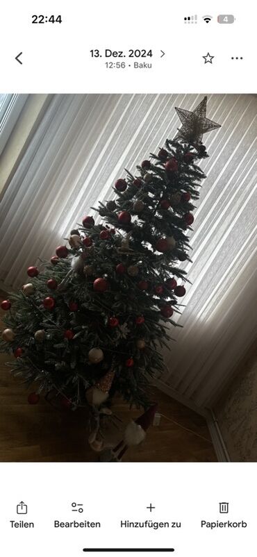 Süslənmiş süni Yeni il şam ağacı - Material: yüksək keyfiyyətli süni iynəyarpaqlar, qar effekti ilə - Təxminən hündürlük: orta ölçülü (ev və ofis üçün uyğun) - Bəzəklər: qızılı iri yay, qırmızı gi...
