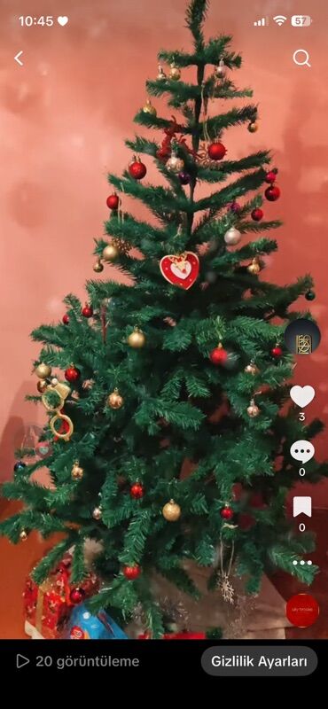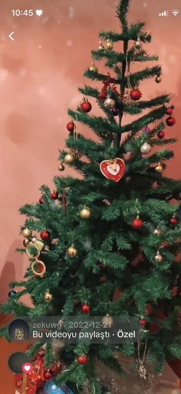 - Komplektdə müxtəlif bəzəklər: qırmızı, qızılı və gümüş şarlar, ürək formalı asma dekor, ulduz/qar dənəsi tipli asmalar, rəngli oyuncaqlar.