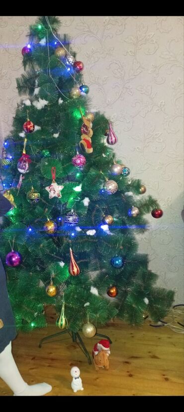 - Bəzəklər dəsti: müxtəlif ölçülü və rəngli şarlar (qızılı, qırmızı, mavi, yaşıl, bənövşəyi və s.), damla formalı oyuncaqlar, naxışlı qlobuslar, fiqurlu asmalar, qızılı bəzək zənciri, dekorativ “qar” parçaları.