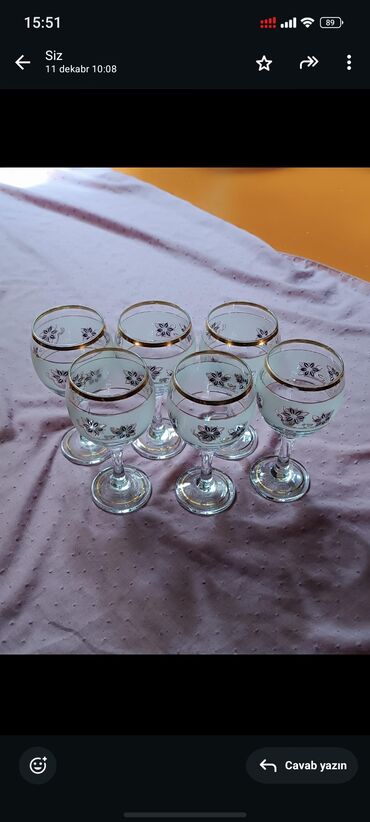 - 6 ədəd balaca şərab/likör qədəhi: şəffaf ayaqlı, açıq şüşə korpus, qızılı haşiyə və çiçək motivləri.