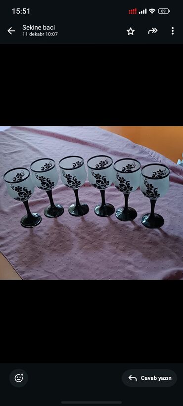 - 6 ədəd qədəh (qamətli ayaqlı): tutqun ağ şüşə korpusa malik, qara ayaq və qara floral rəsmlərlə bəzədilib.