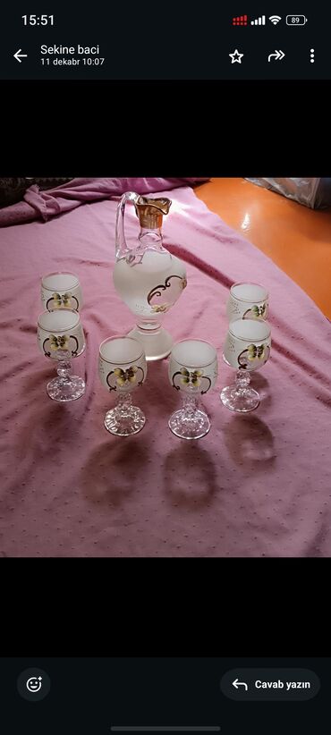 - Qrafın dəsti: dekorativ şüşə qrafın və 6 ədəd balaca qədəh. Qrafın və qədəhlərdə çiçək aplikasiyaları, qızılı konturlar, tutqun-açıq şüşə fakturası.