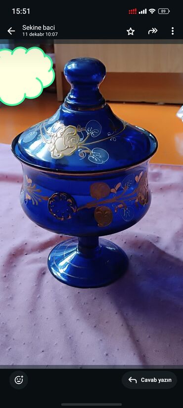 - Kobalt mavisi şüşədən hazırlanmış qapaqlı konfet qabı: ayaqlı, qapaqlı model, üzərində qızılı və ağ naxışlı bitki ornamentləri, relyefli dekor.