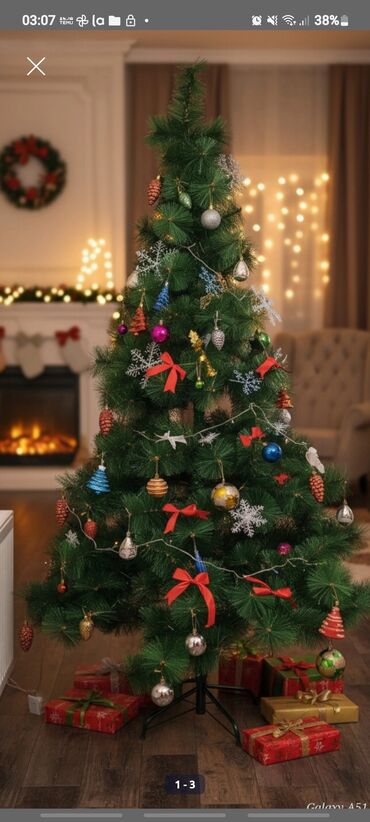 - Üzərində müxtəlif oyuncaqlar və bəzəklər: şüşə və parlaq kürəciklər, şam qozaları, qırmızı lent fişekləri, qar dənəsi fiqurları, miniatür ağac və zəng dekorları