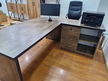 Ofis masası – L formalı dizayn - Material: ağac teksturalı laminat/MDFlam səth - Rəng: tünd qoz (qara dekorativ zolaqlar ilə) - Quruluş: əsas geniş masa + yan konsol/komodin hissəsi - Funksionallı...