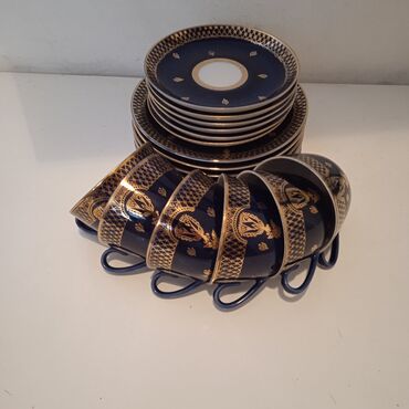 Hamisi birlikde 60 AZN. Zərif naxışları və qızılı haşiyələri olan, kobalt rəngli, zərif çay dəsti. Dəstə çaynik, fincanlar, nəlbəkilər və desert boşqabları daxildir. Ziyafətlər üçün ideal seçimdir.