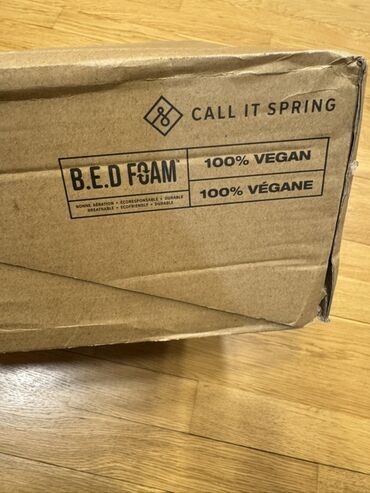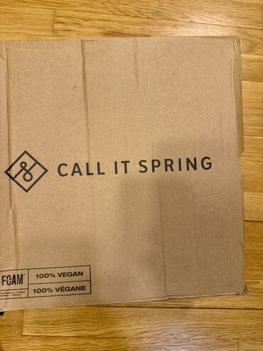 Brend qutusu mövcuddur: “CALL IT SPRING”, “100% VEGAN”, “B.E.D Foam – breathable, durable, eco-friendly” işarələmələri ilə.