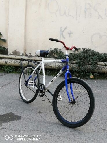 Şəhər velosipedi – klassik tək sürət (single-speed) tipli - Çərçivə: polad, hündür/uzun geometriya, qara rəng üzərində ağ detallar - Sükan: yuxarı qaldırılmış, mavi tutacaqlarla - Oturacaq: dar ti...