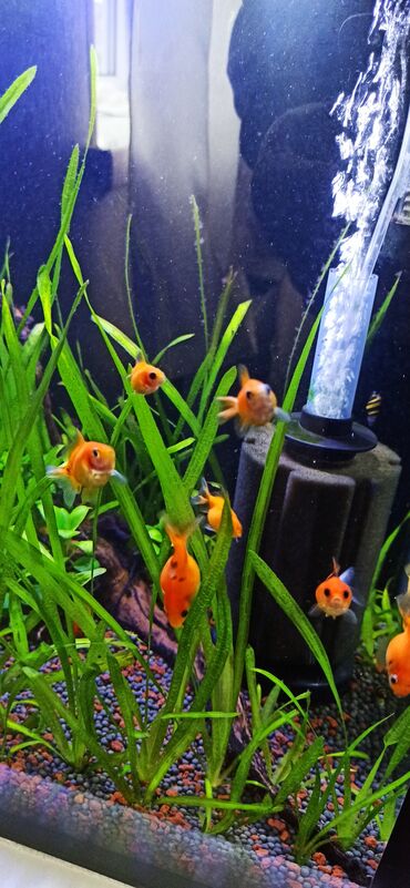 - Sakinlər: Akvariumda xırda ölçülü narıncı-ağ naxışlı tropik balıqlar sürüsü və bir neçə ilbiz görünür.