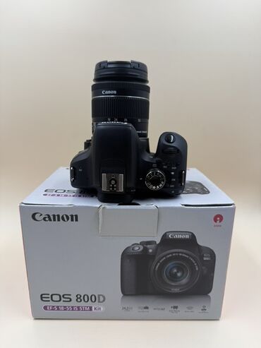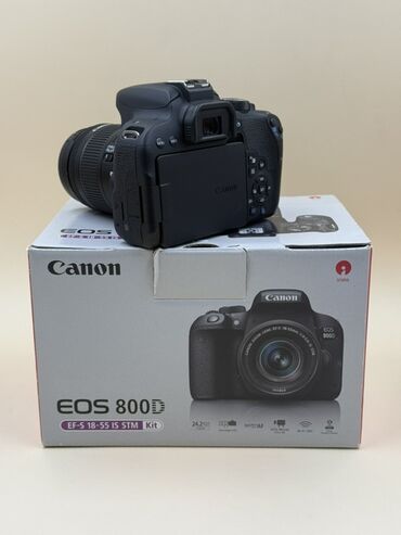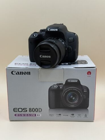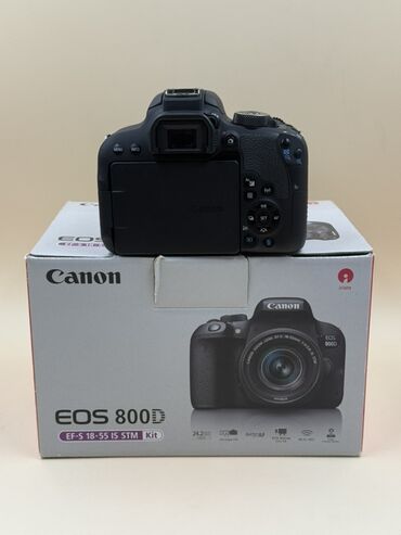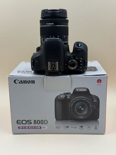 Qutuda: Canon EOS 800D gövdə, Canon EF‑S 18‑55mm IS STM obyektiv, obyektiv qapağı. Qutusu ilə birlikdə göstərilir. Foto və video üçün çox yönlü, yüngül və istifadəsi rahat DSLR.