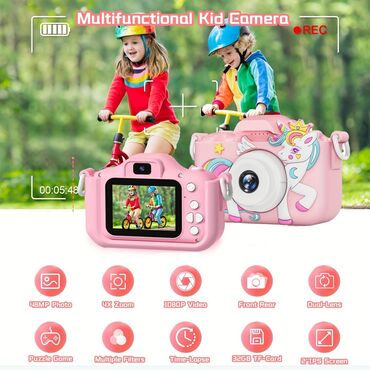 Uşaq fotoaparatı – Cartoon Camera - Rəng: açıq krem və çəhrayı - Dizayn: uşaqlar üçün cazibədar, yuvarlaq korpus, yumşaq tutacaqlar - Linza üzərində qeyd: Full HD Video 1080P - Funksiya: foto və v...