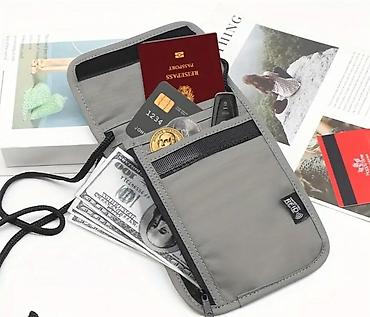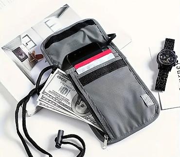 - Boyun/köynək altı səyahət cüzdanı (RFID etiketli): Boz rəng, yapışqan qapaqlı bölmə, kart yuvaları, fermuarlı gizli cib və iplə boyuna asma imkanı. Pasport, bank kartı, pul və açar kimi sənədləri səliqəli və təhlükəsiz saxlamaq üçün.