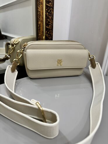Tommy Hilfiger qadın çantası - Rəng: açıq bej (krem) - Material: teksturalı (dəri effektli) xarici səth - Furnitura: qızılı rəngli metal aksessuarlar, ön hissədə “TH” loqosu - Konstruksiya: iki əs...