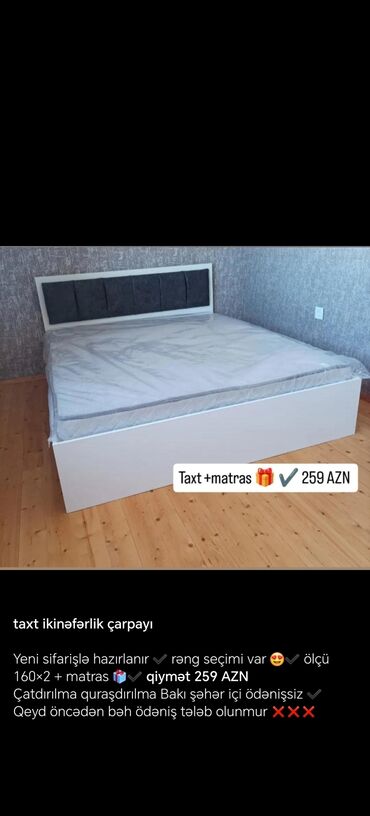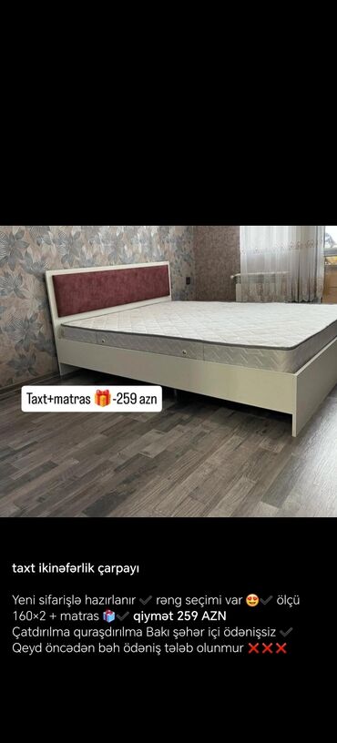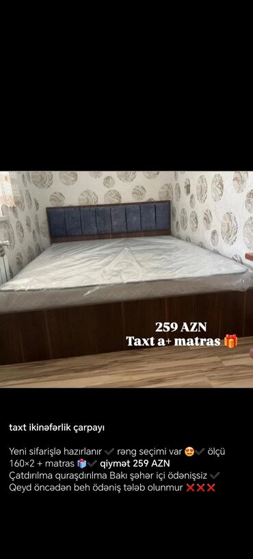 *Taxt / 2 nəfərlik Çarpayı 279AZN💥* ✔️Rəng seçimi var ✔️ ölçü 200x1600 *Şəhər daxili Çatdırılmave Quraşdırılma pulsuz* (Əhmədli 20 yanvar ərazisi) 💥Təhvil qısa zamanda ✔️Material _Rusiya istehsa...