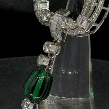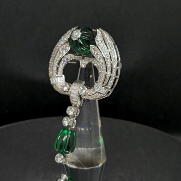 Art Deco üslubunda oyma zümrüd broş. Rotşild ailələri. Dəbdəbəli VVS1 almazları ilə platin/925 sterlinq gümüşdən hazırlanmışdır