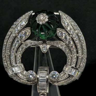 Carved emerald brooch in Art Deco style. Rothschild family. In platinum/sterling silver with luxurious VVS1 diamonds