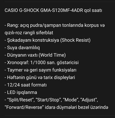Casio G‑Shock GMA-S120MF-4APR modeli – zərbəyə davamlı, idman üslubunda kvars qol saatı.Təzədir!!Cüzi endirim eləmək olar.