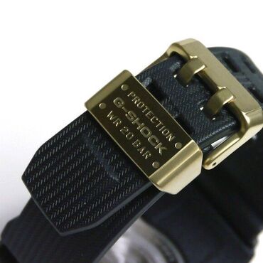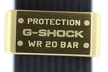 - Qayış: teksturalı qara rezin; metal qızılı rəngli bərkitmə və “PROTECTION G‑SHOCK WR 20 BAR” yazılı plaka