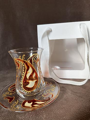 Məhsul: Şüşə çay stəkanları dəsti – 6 ədəd Təsvir: - Klassik “armudu” formalı şəffaf şüşə stəkanlar - Hər stəkan üçün ayrılıqda qızılı rəngdə metal bərkidici altlıq və qulp - Altlıqlar üzərində oy...