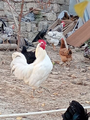 Məhsul: Xoruzlar və toyuqlar (qarışıq sürü) Təsvir: - Şəkillərdə iri gövdəli, qırmızı daraqlı xoruzlar və bir neçə toyuq görünür. - Ləkəli-qara-ağ rəng çalarları üstünlük təşkil edir; bəzi fərdlər...