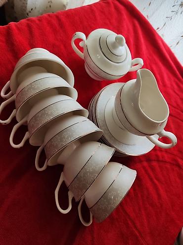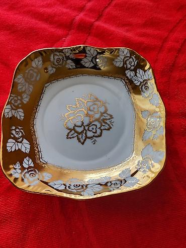 Porselen süfrə dəsti – gül naxışlı, qızılı haşiyəli Tərkib: - 2 ədəd oval servis boşqabı (biri daha iri, biri kiçik) - 1 ədəd iri dərin porselen qazan/kasa qapaqlı, iki qulp ilə - 1 ədəd kiçik süd...