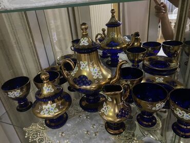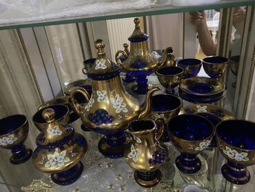 Bu dəstə şamdanlar, qəhvədan, çaydan, süd qabı, şəkər qabı, böyük boşqab, kiçik boşqablar və qədəhlər daxildir. Hər bir parça tünd göy rəngdə şüşədən hazırlanıb və üzərində qızılı naxışlar, ağ və b...