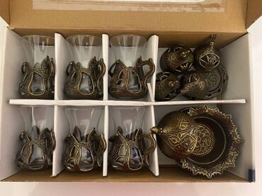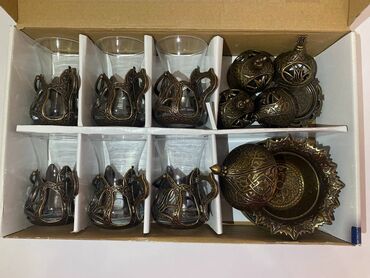 Çay dəsti – 6 ədəd stəkan və 6 ədəd qaşıq - Stəkanlar: Şüşə içlikli, metal qandalı və ayaqlı tutacaq. Korpus üzərində relyef gül naxışları və bəzək elementləri, hər hissədə firuzə rəngli dekorativ...