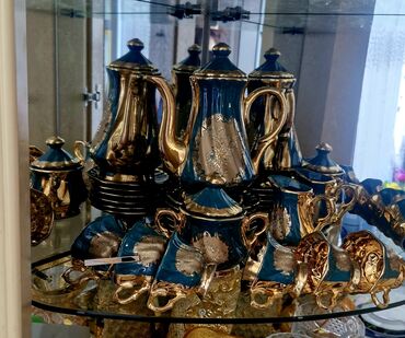 Mətbəx/qonaq süfrəsi üçün kolleksiya qab-qacaq və dekor dəstləri - Holland istehsalı “Muider Holland – printed in Holland” işarəli çay dəsti: qızılı haşiyəli, qızıl medalyonlu boşqablar, güllü nax...
