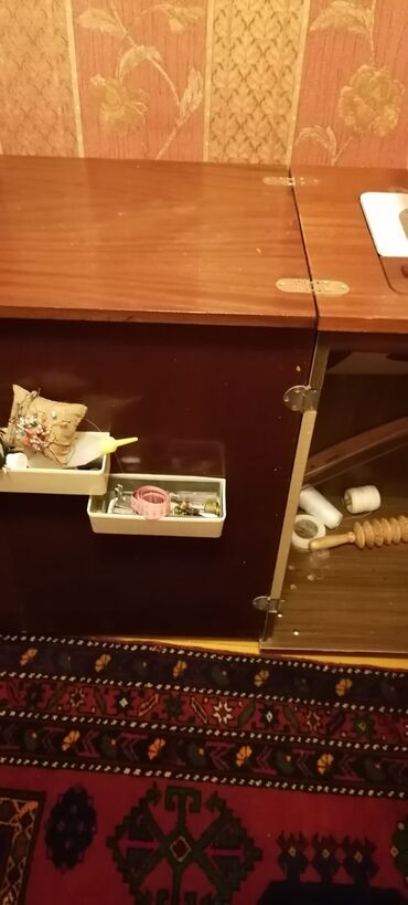 - Komplekt: ağac şkaf-stol (qatlanan iş səthi), daxili rəflər və alət qutuları; bobinlər, müxtəlif sap rulonları, lent ölçüsü, iynə-yastığı və xırda tikiş ləvazimatları