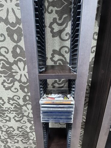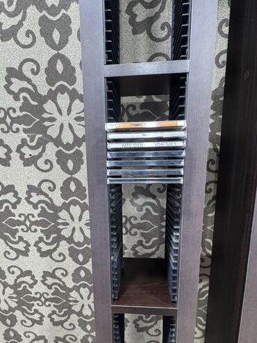 - Ölçülər (təxmini): hündürlük təxminən tavanayadək (yüksək şaquli konstruksiya), en hər rəf üçün dar format; dərinlik CD/DVD qutularına uyğundur