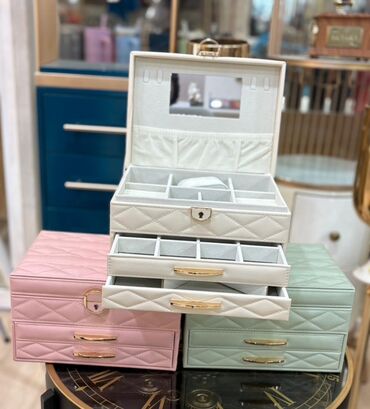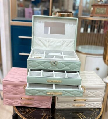 - Fərqli bölmələr: üst hissədə üzük, sırğa və xırda aksesuarlar üçün ədədli bölmələr; qolbaq/saat üçün yastıq; elastik cib