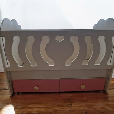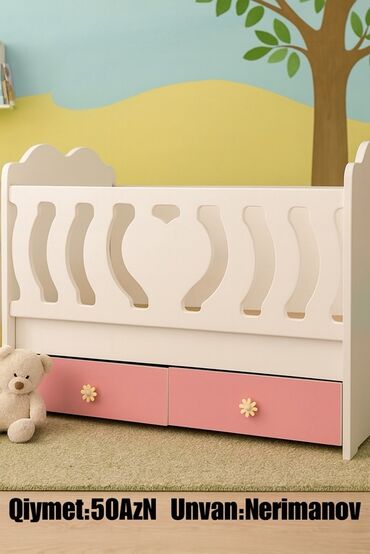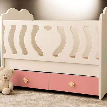 Məhsul: Uşaq beşiyi (2 ədəd) - Material: Ağ rəngli MDF/taxta konstruksiya - Dizayn: Ön paneldə çəhrayı lent fiquru, dalğalı başlıq - Yan tərəf: Sürüşən/qaldırılan məhəccər (uşağı asan yerləşdirmək...