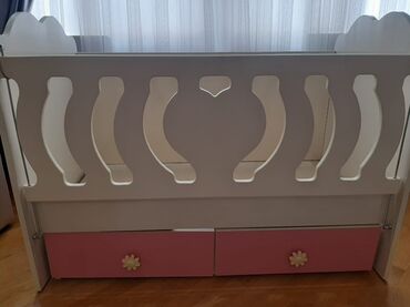 Uşaq beşiyi və komodlu çarpayı sistemi - Ölçü: standart beşik ölçülü, yan tərəfdə inteqrasiya olunmuş komod və dolab hissəsi - Rəng: ağ və çəhrayı, dekorativ ürək naxışları - Material: taxta/MDFla...