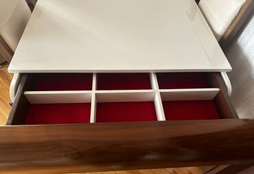 - Masa: Möhkəm taxta karkas, qəhvəyi ağac teksturası ilə. Üst səth parlaq krem/ağ rəngdədir, təmizlənməsi asan. Masanın ön hissəsində geniş çekmece var; içi qırmızı üzlüklə işlənib, ağ bölücülərlə 6 hissəyə ayrılıb – çəngəl-bıçaq, salfet və digər aksesuarlar üçün səliqəli saxlama imkanı yaradır.