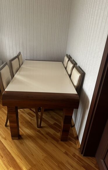 - Oturacaqlar: Taxta çərçivə, açıq krem rəngli yumşaq oturacaq və bel dayağı. Hündür bel hissəsi rahat oturuş təmin edir, düz xətləri ilə modern görünüş yaradır.