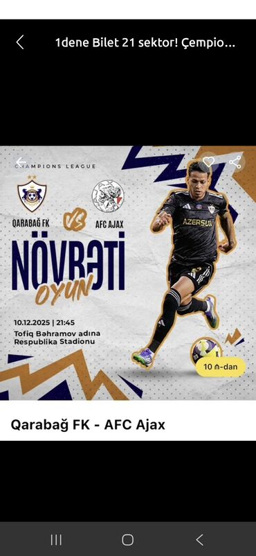 Məhsul: Qarabağ FK – AFC Ajax oyununun biletləri Tədbir: - Turnir: UEFA Champions League - Tarix və saat: 10 dekabr, 21:45 - Məkan: Tofiq Bəhramov adına Respublika Stadionu Sektor 8 sira 11 yer 6...