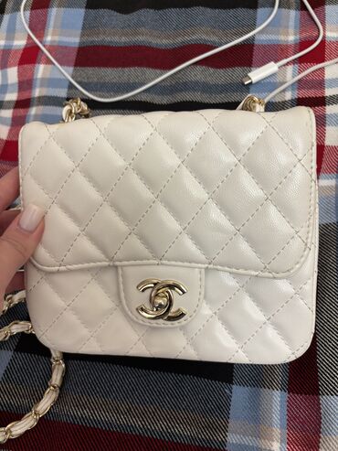 Chanel qadın çantası – ağ rəngdə, klassik kvilt (romb) tikişli dizayn. Xüsusiyyətlər: - Ön qapaqda ikili “CC” loqosu və alt hissədə “CHANEL” yazısı - Dəstəklə daşımaq üçün yuxarı tutacaq - Çiyin v...