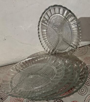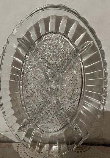 Kristall şirniyyat/servis boşqabı - Material: qalın, şəffaf kristal şüşə - Forma: dairəvi, dalğalı kənarlı - Dizayn: mərkəzdə xırda kvadrat və ulduzvari kəsim naxışları, kənarlarda fan-şəkilli və ...