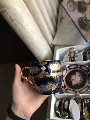Zərif kobalt-mavi rəngdə, qızılı çiçək naxışları ilə bəzədilmiş farfor fincan dəsti. - Fincan Sayı: 6 fincan - Boşqab Sayı: 6 boşqab - Material: Farfor - Rəng: Kobalt-mavi, qızılı naxışlarla - Diza...