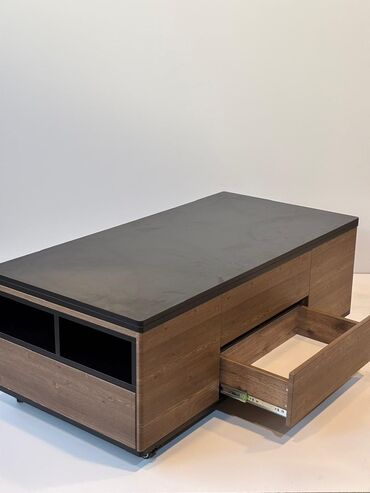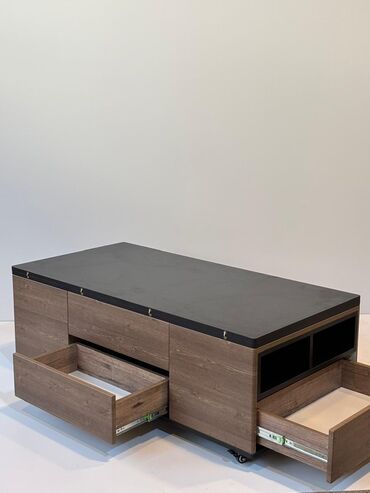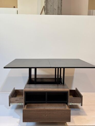 Transformasiya olunan qonaq otağı masası - Material: ağac teksturalı laminat səth, möhkəm metal mexanizm - Funksiya: qaldırılıb açılan üst panel – kofe masası ölçüsündən yemək/iş masası ölçüsünə k...