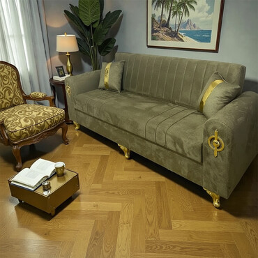 - Yan hissələr: rulon formalı qolçaqlar, qızılı metal dekor elementləri ilə