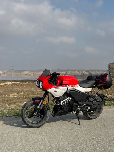 Falcon sport/naked tərzli motosiklet - Rəng: qırmızı-ağ, qara detallarla - Kuzov: şəhər/sport dizayn, aqressiv faralar, aerodinamik plastiklər - Mühərrik: tək silindr, hava soyutmalı karbüratorlu ...