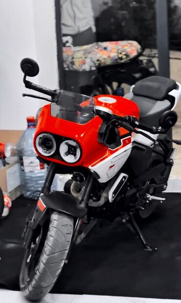 Məhsul: Street tipli sport motosiklet Xüsusiyyətlər və detallı təsvir: - Gövdə rəngi: parlaq qara, qırmızı şassi və dekorativ qırmızı vurğular - Çərçivə: borulu qırmızı trellis tipli konstruksiya ...