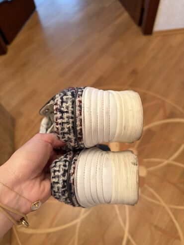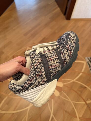 Boz rəngdə qara naxışlı və qırmızı-yaşıl zolaqlı uniseks idman ayaqqabıları. Ayaqqabı bağları boz rəngdədir və qızılı metal bəzəkləri var. Ağ və qara rəngli qalın dabanı gündəlik istifadə üçün raha...