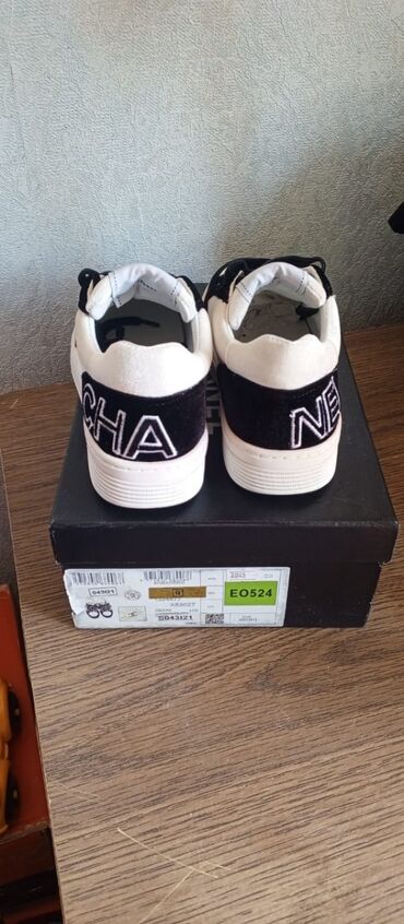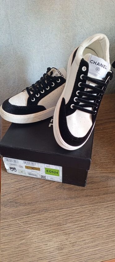 Chanel brendinə məxsus qara və ağ rəngli dəri və parçadan hazırlanmış qadın krossovkaları. Ayaqqabının yan tərəfində və arxa hissəsində "CHANEL" yazısı ağ rəngdə işlənib. Bağcıqlı dizaynı rahat geyimi təmin edir. Gündəlik istifadə üçün uyğundur.
