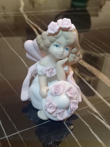 Porselen mələk fiquru 17 azn - Material: parlaq glazurlu porselen - Dizayn: qanadlı mələk uşaq fiquru, əlində güllə - Rənglər: açıq bənövşəyi don, krem və ağ tonlarda detallarla - Üslub: zərif, ro...