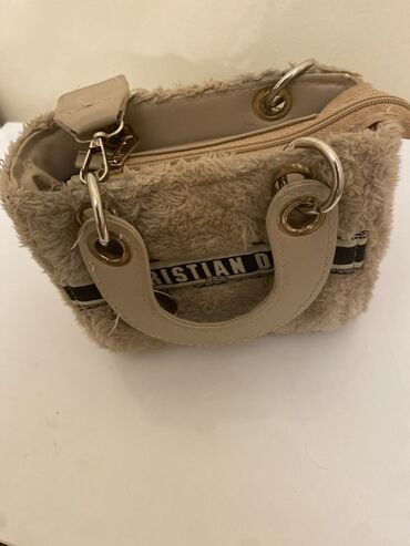 Christian Dior brendinə məxsus kiçik ölçülü, süni xəzdən hazırlanmış əl çantası. Açıq qəhvəyi rəngdə olan bu çanta, üzərində "CHRISTIAN DIOR" yazısı olan parçadan hazırlanmış çiyin qayışı ilə tamamlanır. Çantanın qulpları və metal detalları açıq bej rəngdədir. Bağlama hissəsi fermuarlıdır və bir tərəfində metal D hərfi formalı cazibədar asqı yerləşir. Gündəlik istifadə üçün uyğun olan bu çanta, zərif və dəbli görünüş təmin edir.