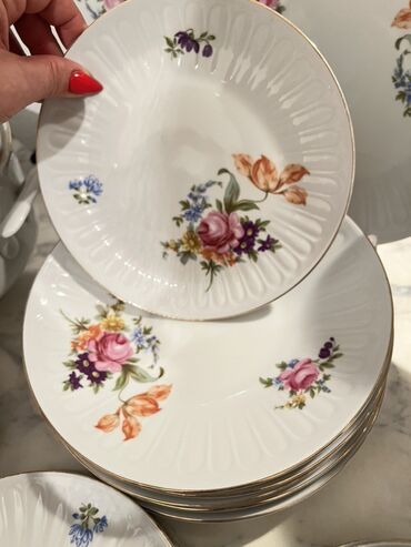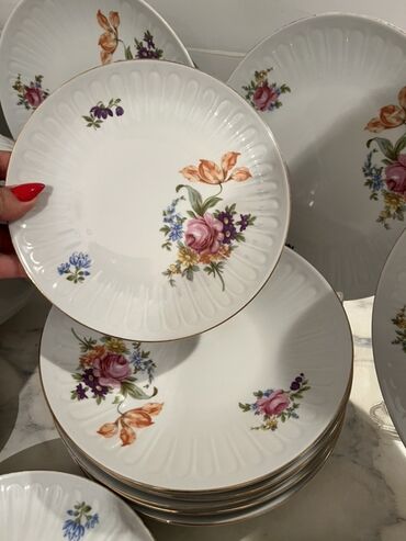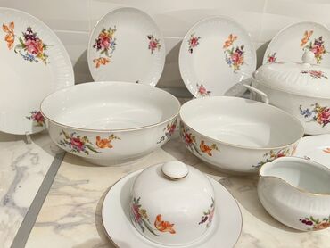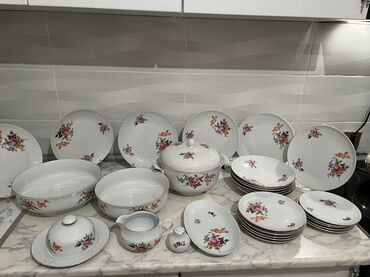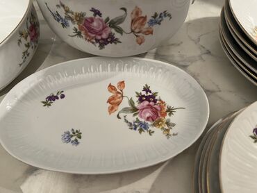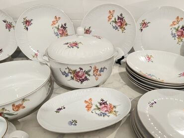 Qab-qacaq dəstləri – klassik porselen və büllur kolleksiya 1) Porselen yemək-servis dəsti - Ağ fon üzərində narıncı-çəhrayı çiçək naxışları, gümüşü kontur xətləri - Böyük süfrə boşqabı (təqr. ölçü...